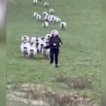 Una donna che corre giù dalla collina inseguita da 37 pecore e due montoni VIDEO