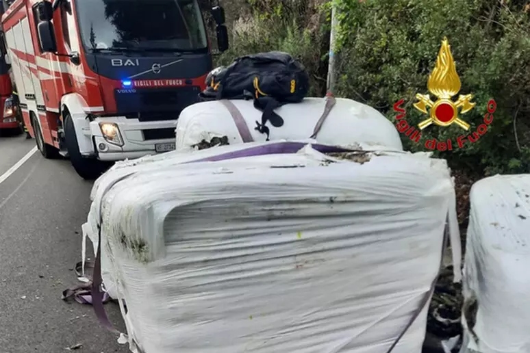 Un camion in transito ha perso parte del carico di ecoballe che ha travolto un gruppo di ciclisti sulla corsia opposta.