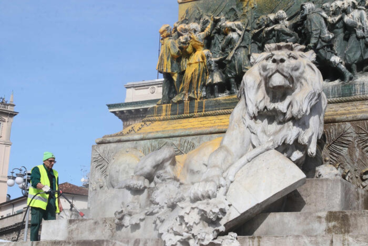 "Deportato Mohamed Shahin libero", Ultima Generazione imbratta la statua di Carlo de Robillant a Milano FOTO (foto Ansa-Blitzquotidiano)