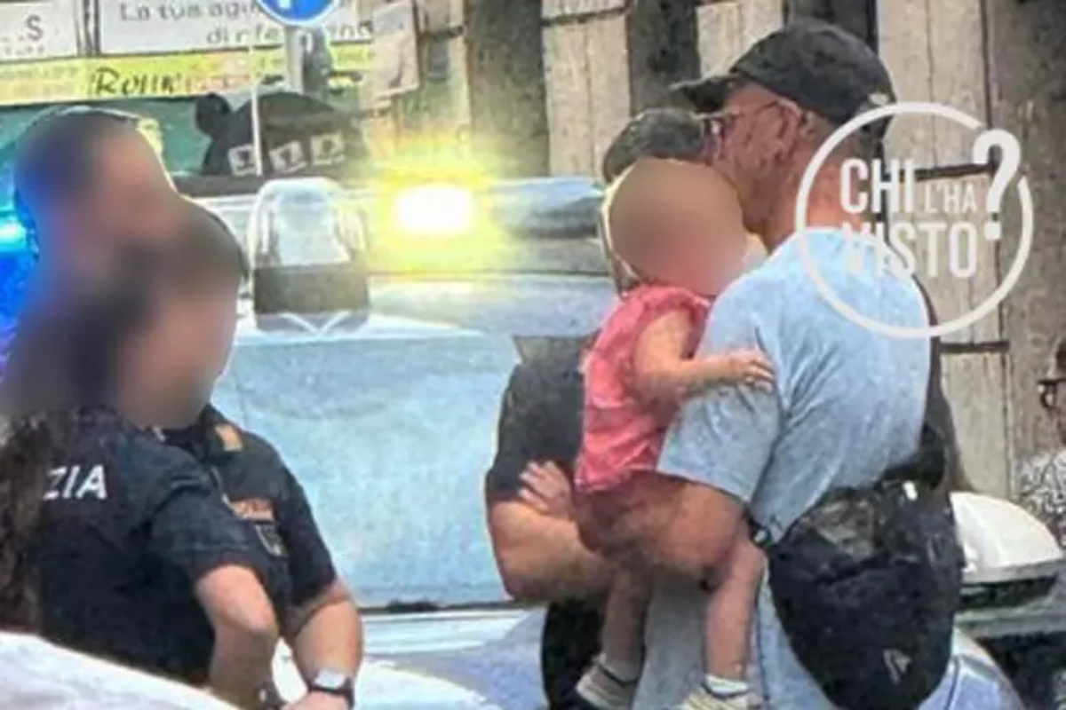 A diffondere lo scatto che ritrae l’uomo in pantaloncini, maglietta e cappellino con la bimba di pochi mesi che indossa un vestitino rosa, è stata la trasmissione “Chi l’ha visto?”. Intorno a lui gli agenti di polizia, chiamati perché – rende noto il programma – la bimba piangeva. A loro ha detto di essere il padre.