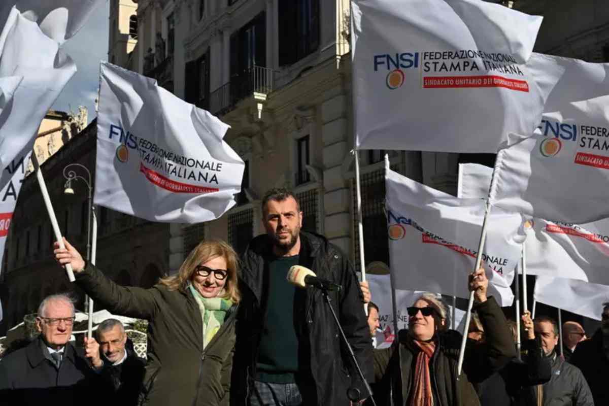 Nella foto Ansa la segretaria della Fnsi Alessandra Costante insieme a Stefano Ferrante, il segretario di Stampa Romana