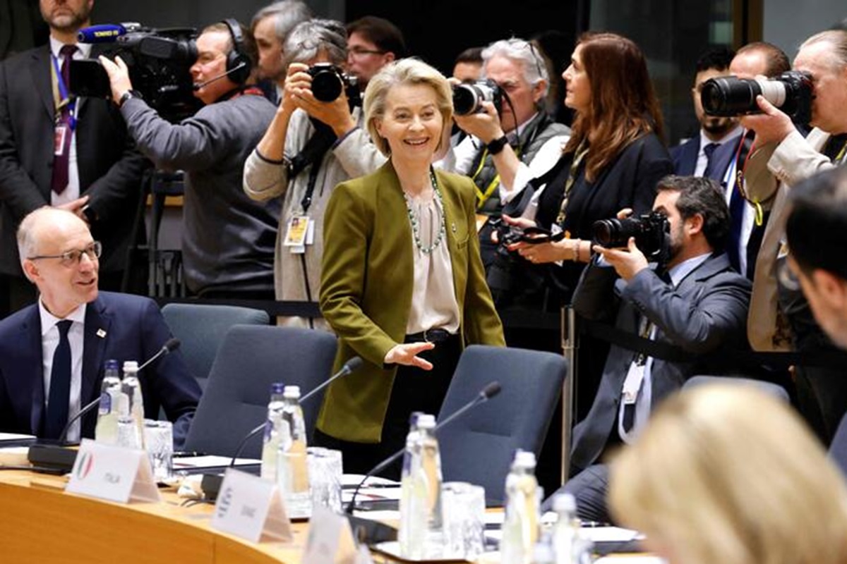 La presidente della Commissione europea Ursula von der Leyen al vertice del Consiglio UE (Foto Ansa)