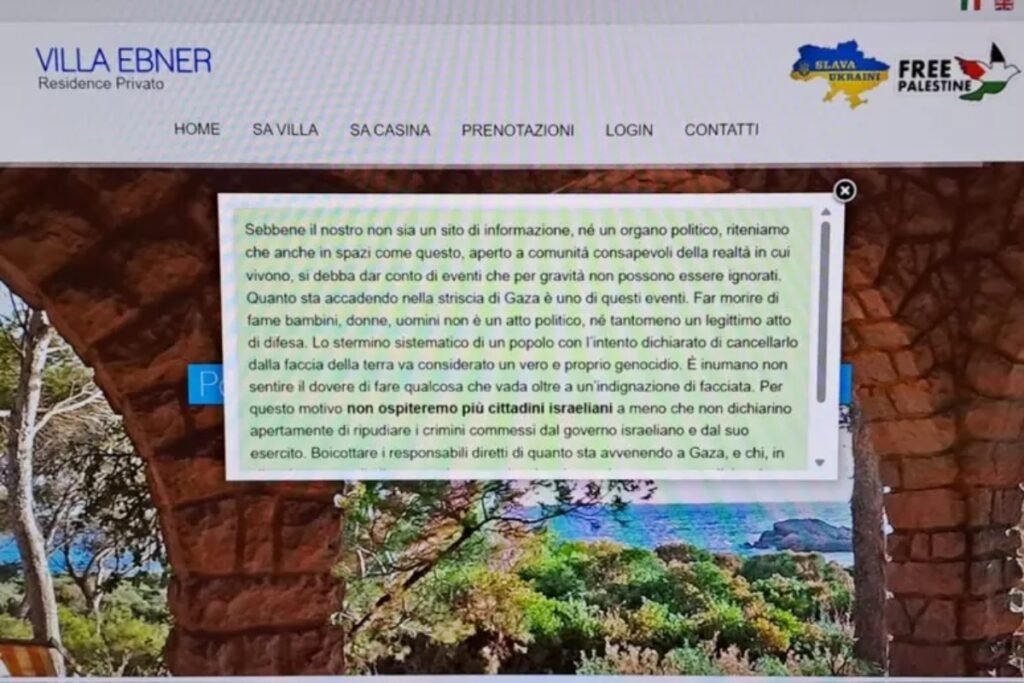Il sito del residence Villa Ebner di Porto Pino, sulla spiaggia con le dune a una cinquantina di chilometri da Cagliari, manda subito due messaggi molto chiari: “Slava Ukraini” (gloria all’Ucraina) e Free Palestine (Palestina libera).