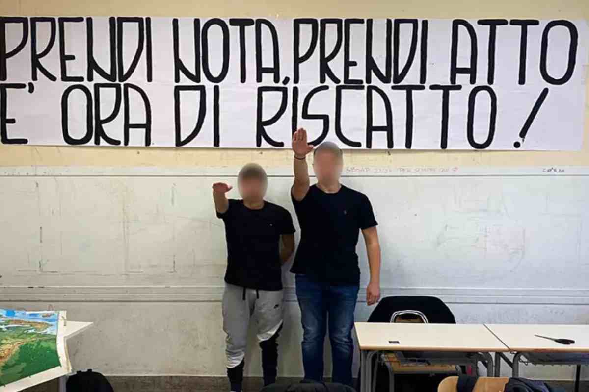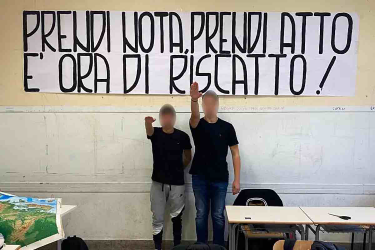 Due studenti vengono fotografati mentre in classe fanno il saluto romano. Dietro di loro uno striscione con su scritto “Prenid nota prendi atto, è ora di riscatto!” I due giovani si sono fatti fotografare così per promuovere la loro lista di rappresentanza studentesca che si chiama per l’appunto “Riscatto”. E’ accaduto a Roma al Liceo Montessori che si trova nel quartiere Salario.