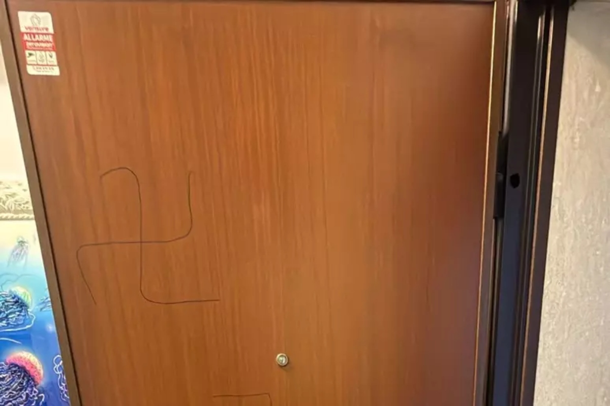 Una incisione sulla porta con svastica e un insulto agli ‘Ebrei’ sulla porta di un appartamento a Milano in zona Forze Armate, vicino quindi al quartiere ebraico.
