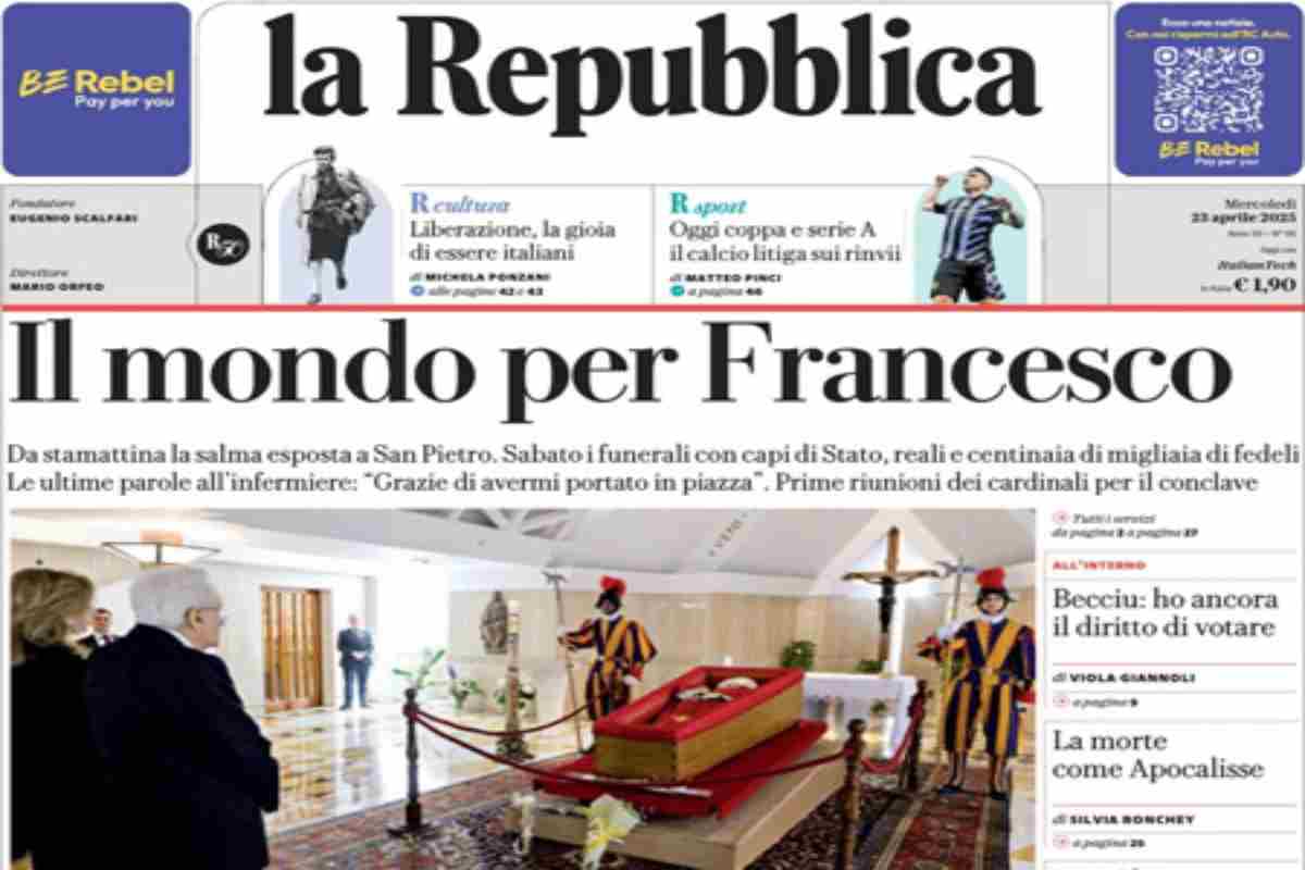 I titoli dei quotidiani oggi si concentrano sul funerale di Papa Francesco, in programma sabato mattina con la partecipazione di molti leader mondiali; sull’esposizione della salma, da oggi a venerdì a San Pietro per l’omaggio della gente; sulle ipotesi su chi potrebbe essere il suo successore e sulla decisione del governo di proclamare cinque giorni di lutto nazionale, con la richiesta di celebrazioni “sobrie” per il 25 aprile. “Il mondo per Francesco”, titola Repubblica. L’abbraccio a Francesco”, è l’apertura del Corriere della Sera. “Scoppia la rissa pure sul Papa morto”, è invece la prima pagina di Libero.