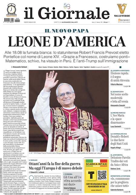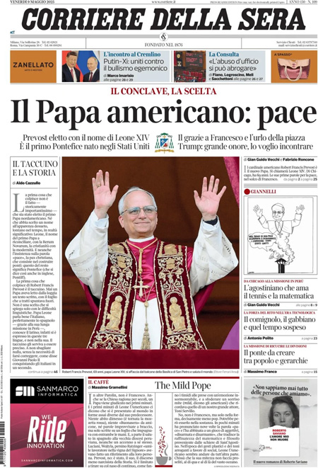 “Il taccuino e la storia”. L’editoriale di Aldo Cazzullo: “La prima cosa che colpisce non è il fatto — storicamente importantissimo — che sia stato eletto il primo Papa nordamericano. Né che abbia scelto un nome all’apparenza desueto, lontano nel tempo, in realtà significativo: Leone, il nome del primo Papa a riconciliare, con la Rerum Novarum, la cristianità con la modernità. E neanche l’insistenza sulla parola «pace», la pax christiana, che consiste nel costruire ponti: questo del resto significa Pontefice (che si dice così anche in inglese, Pontiff)”.