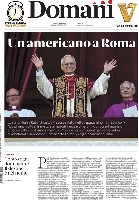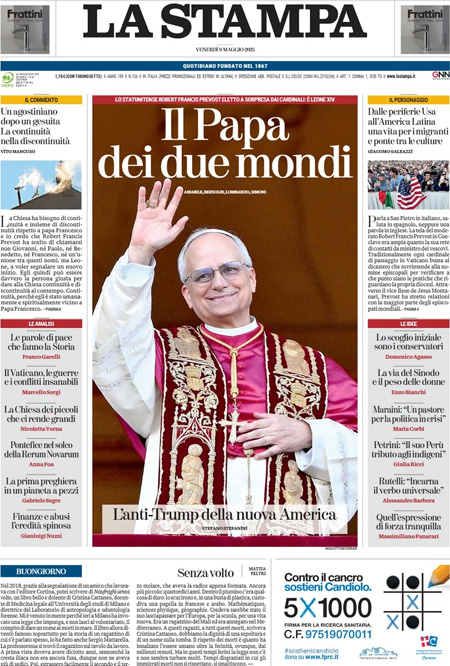 La notizia principale di oggi in apertura sui quotidiani è quella relativa all’elezione del nuovo Papa, il cardinale statunitense Robert Francis Prevost, che ha scelto il nome di Leone XIV. “Il Papa dei due mondi”, titola La Stampa. “Il Papa americano”, è l’apertura di Repubblica. “Sarà un altro Bergoglio?”, titola invece La Verità.