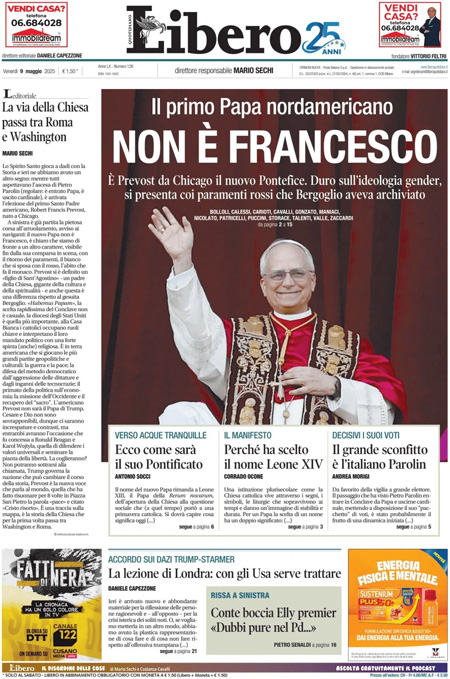 “La via della Chiesa parra tra Roma e Washington”. L’editoriale di Mario Sechi: “Lo Spirito Santo gioca a dadi con la Storia e ieri ne abbiamo avuto un altro segno: mentre tutti aspettavano l’ascesa di Pietro Parolin (regolare: è entrato Papa, è uscito cardinale), è arrivata l’elezione del primo Santo Padre americano, Robert Francis Prevost, nato a Chicago. A sinistra è già partita la pietosa corsa all’arruolamento, avviso ai naviganti: il nuovo Papa non è Francesco”.