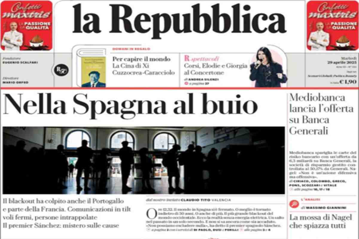 “Il blackout paralizza Spagna e Portogallo. Fermi voli e treni, tutte le città nel caos” (Il Corriere della Sera).