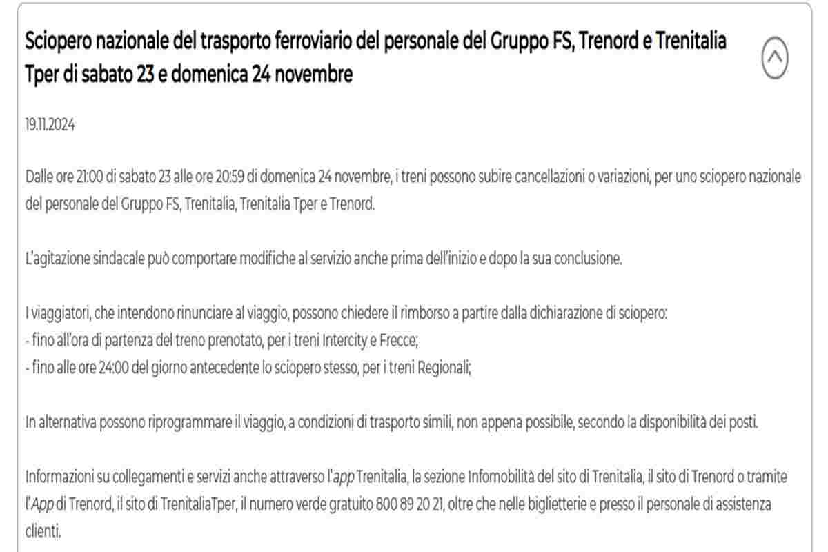 “Dalle ore 21:00 di sabato 23 alle ore 20:59 di domenica 24 novembre – si legge nel comunicato di Trenitalia – i treni possono subire cancellazioni o variazioni, per uno sciopero nazionale del personale del Gruppo FS, Trenitalia, Trenitalia Tper e Trenord. L’agitazione sindacale può comportare modifiche al servizio anche prima dell’inizio e dopo la sua conclusione. I viaggiatori, che intendono rinunciare al viaggio, possono chiedere il rimborso a partire dalla dichiarazione di sciopero: – fino all’ora di partenza del treno prenotato, per i treni Intercity e Frecce; – fino alle ore 24:00 del giorno antecedente lo sciopero stesso, per i treni Regionali; In alternativa possono riprogrammare il viaggio, a condizioni di trasporto simili, non appena possibile, secondo la disponibilità dei posti. Informazioni su collegamenti e servizi anche attraverso l’app Trenitalia, la sezione Infomobilità del sito di Trenitalia, il sito di Trenord o tramite l’App di Trenord, il sito di TrenitaliaTper, il numero verde gratuito 800 89 20 21, oltre che nelle biglietterie e presso il personale di assistenza clienti”.