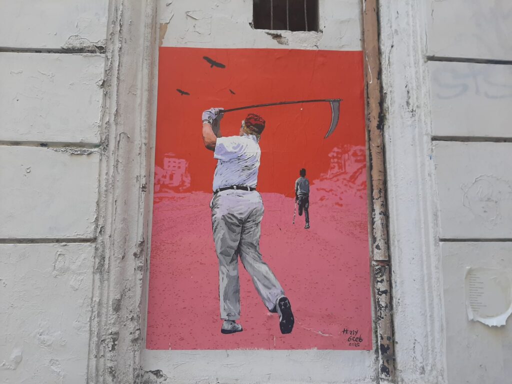 Si intitola “Resort Gaza” ed è un chiaro riferimento a quei video condivisi dal presidente americano Donald Trump, creati con l’intelligenza artificiale, in cui il tycoon immagina una Striscia di Gaza ricostruita con grattaceli e palazzi di lusso al posto delle macerie. In uno degli ultimi murales dell’artista Harry Greb a Roma (siamo in Piazza di Sant’Apollonia, a due passi da Santa Maria in Trastevere) si vede invece il primo inquilino della Casa Bianca che imbraccia una mazza da golf a forma di falce, ma invece di colpire una palla, prende di mira un bambino mutilato che cammina con le stampelle.