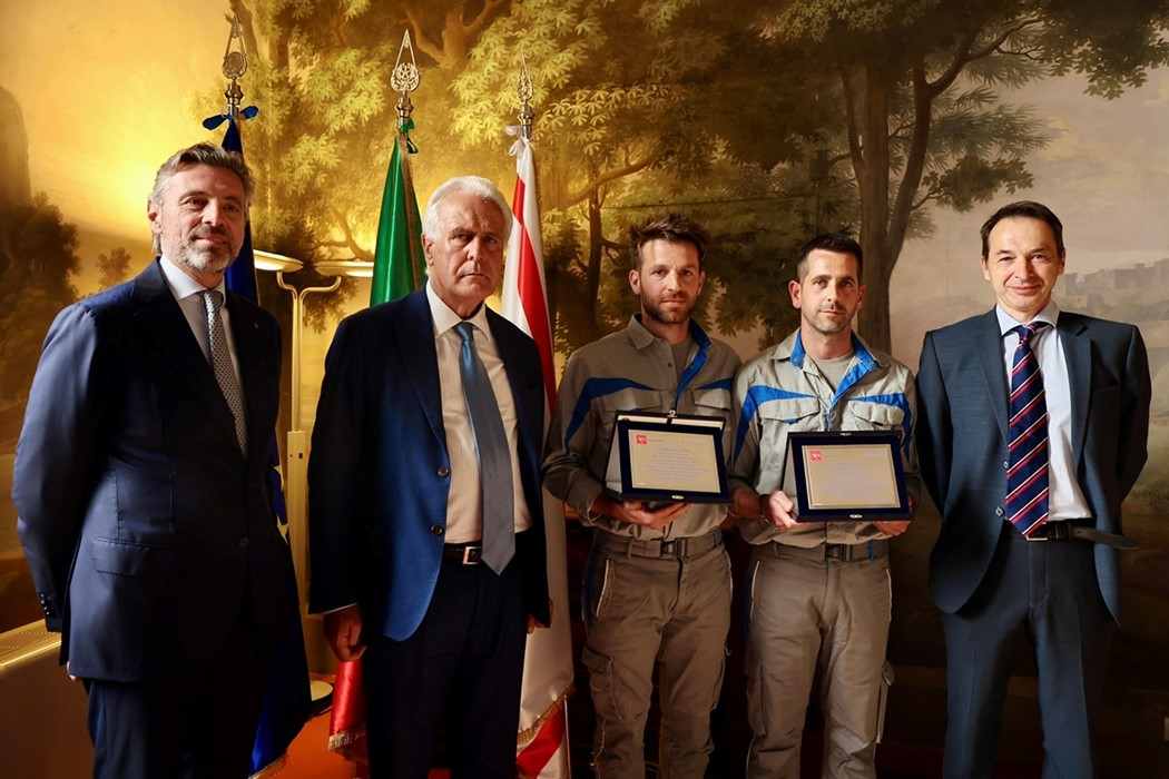 “A Giacomo e Nicola, dipendenti di E-Distribuzione del Blue Team Volterra – Unità Territoriale Pisa, con profonda gratitudine per la professionalità, lo spirito di servizio e l’eroica umanità con cui durante lo svolgimento dell’attività di presidio della rete elettrica nella tragica alluvione della notte tra il 23 e il 24 settembre, in località Gabella a Montecatini Val di Cecina, hanno portato in salvo bambini e famiglie”. Questo il testo riportato sulla targa che è stata consegnata dal presidente della Regione Toscana Eugenio Giani e dal responsabile people & organization Italia di Enel Aldo Forte a Giacomo Mercatini e Nicola Iacomelli, dipendenti di E-Distribuzione, che la sera tra il 23 ed il 24 settembre a Montecatini val di Cecina grazie al loro coraggio, alla generosità ed alla prontezza di spirito misero in salvo alcune famiglie in pericolo a causa dell’esondazione del torrente Sterza.