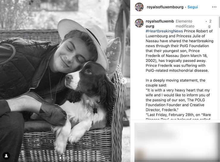A darne il triste annuncio è stata la Cassa Reale di Lussemburgo dato che è morto il Principe Federico, figlio del Principe Roberto e della moglie Julia di Nassau. Il ragazzo aveva infatti 22 anni e stava combattendo contro una rara malattia. Il nipote del Granduca Henri è quindi scomparso il 28 febbraio, ma l’annuncio è stato dato solo adesso da parte della Famiglia Reale, che ha reso omaggio al giovanissimo con un post social. A farlo andare via per sempre è appunto stata la POLG, una patologia che gli era stata diagnosticata quando aveva solo 14 anni.