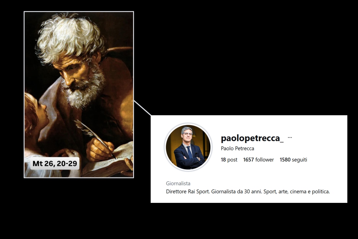 Petrecca si limita a postare l’immagine di un affresco che rappresenta l’apostolo, con le coordinate “Mt 26, 20-29”, che contengono appunto le parole di Gesù durante l’Ultima Cena. Che poi, in verità, la fila c’era, altro che uno di voi. Che poi, a prendersi nientemeno che per Gesù Cristo, a fare la vittima è facile esporsi a secchiate di soda caustica.