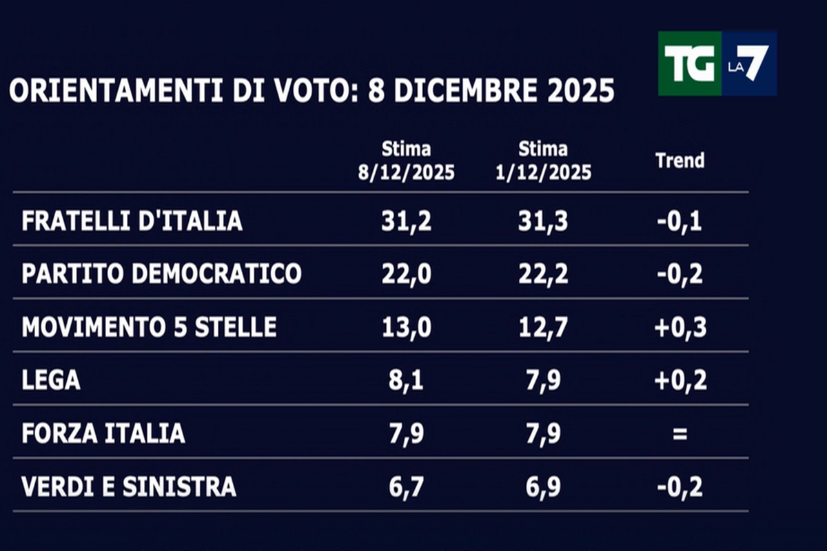 Il nuovo sondaggio Swg per il Tg La7 dell’8 dicembre 2025 segnala un lieve calo per Fratelli d’Italia e Partito Democratico e una crescita per il Movimento 5 Stelle. Il partito di Giorgia Meloni resta nettamente il primo nel Paese, ma scende al 31,2% dopo un nuovo -0,1%. Il PD di Elly Schlein registra un arretramento leggermente più marcato (-0,2%) e si attesta al 22%, confermando la seconda settimana consecutiva di flessione. Tra le opposizioni, il M5S di Giuseppe Conte ottiene il miglior risultato, guadagnando lo 0,3% e salendo al 13%. Nel centrodestra prosegue il recupero della Lega, ora all’8,1% (+0,2%), mentre Forza Italia rimane stabile al 7,9%. Scendono Verdi e Sinistra, fermi al 6,7%. Più distanti le forze minori, con Azione al 3,2%, Italia Viva al 2,4%, +Europa all’1,4%, Noi Moderati all’1,2% e le altre liste al 2,9%.