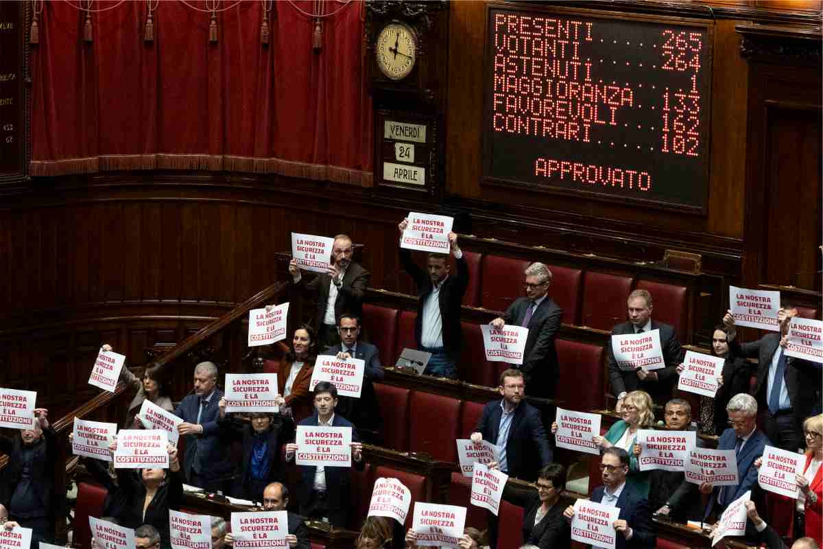 I cartelli mostrati dall'opposizione durante il voto per il Dl Sicurezza (foto Ansa) - Blitz Quotidiano