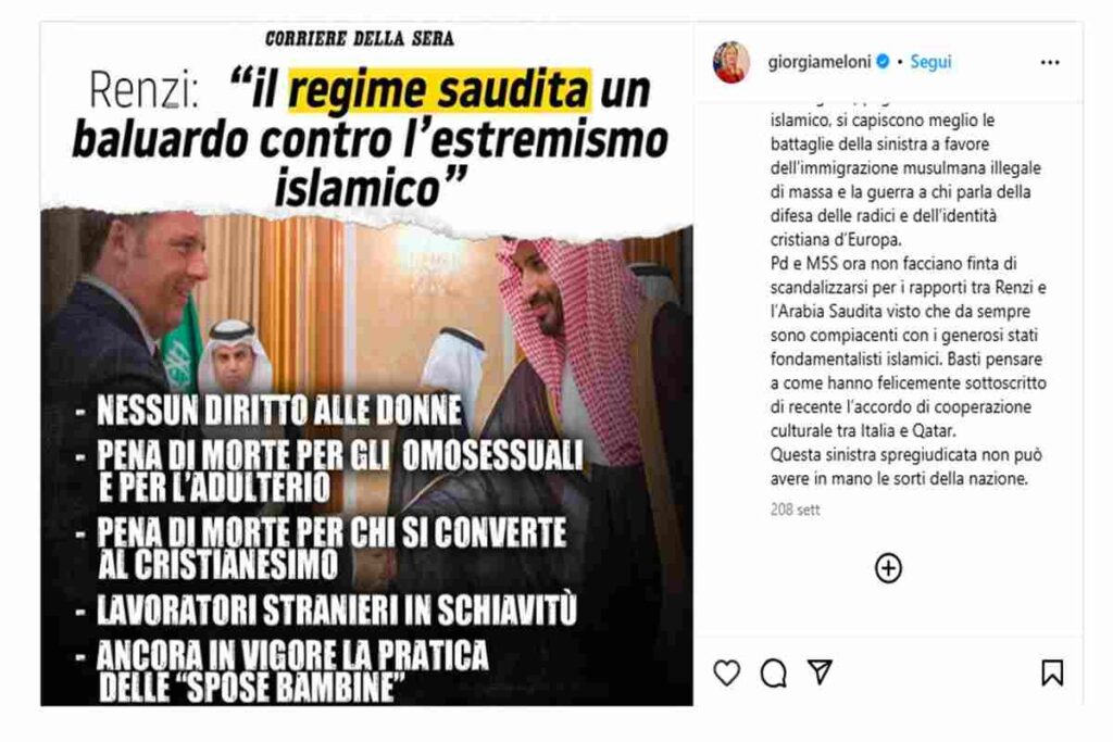 Ipse Dixit, quando Giorgia Meloni tuonava: "L'Arabia Saudita è uno stato fondamentalista islamico". Detto, fatto: accordo firmato con bin Salman (Foto da Instagram) - Blitz Quotidiano