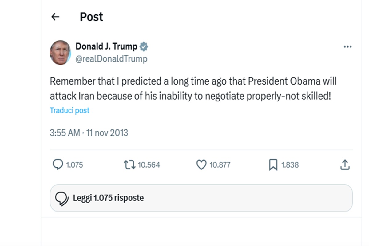 “Molto tempo fa avevo previsto che il Presidente avrebbe attaccato l’Iran a causa della sua incapacità di negoziare correttamente – non è abile!” Secondo voi chi lo ha detto? Bernie Sanders? Un qualsiasi democratico antri trumpiano? No, lo disse Donald Trump. Era l’11 novembre del 2013 e l’attuale presidente statunitense stava attaccando Barack Obama. D’altronde, la coerenza politica non è certo una delle qualità più di moda nel pianeta.