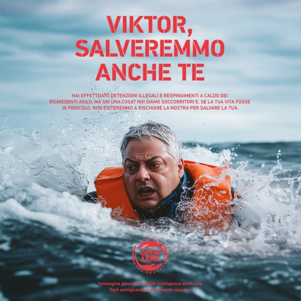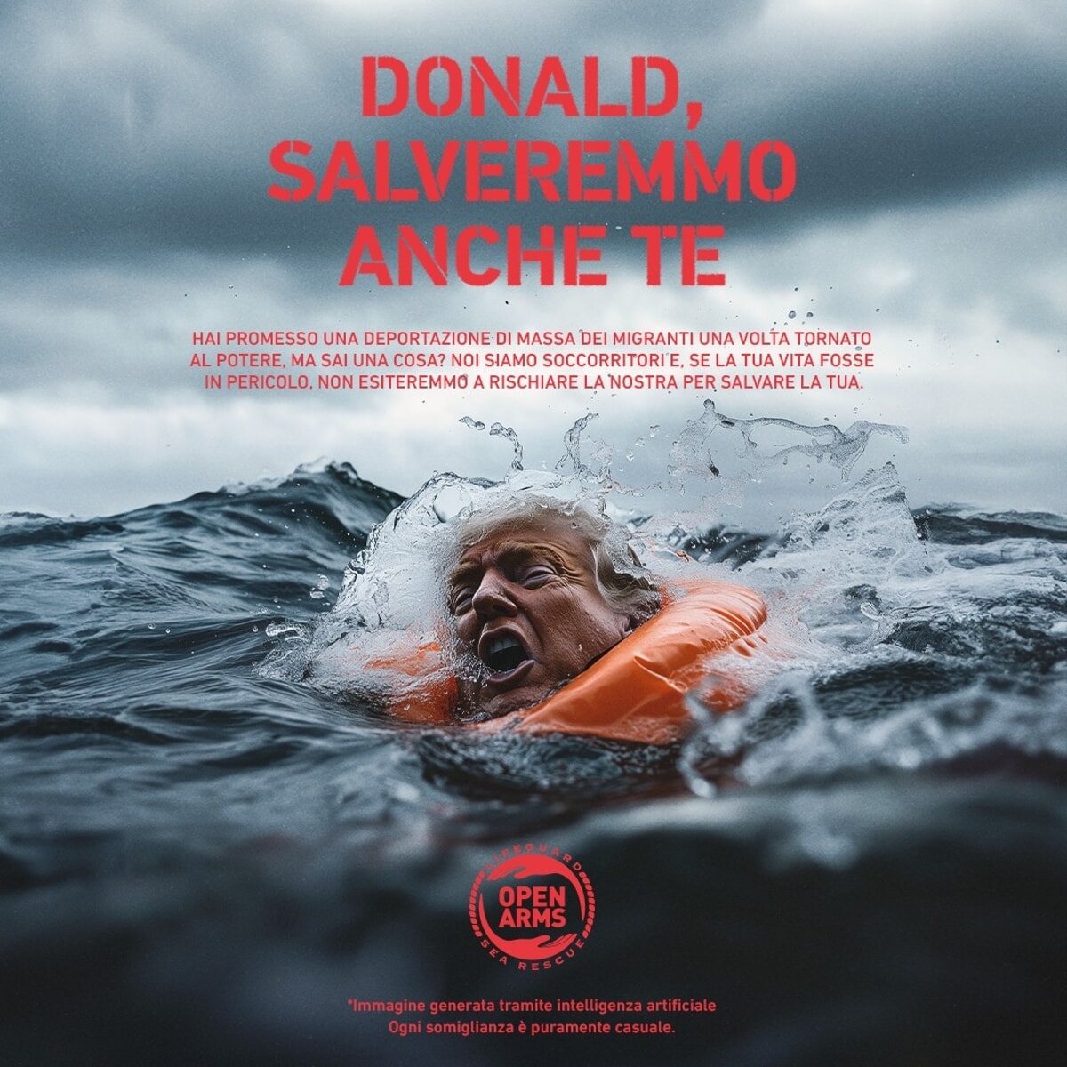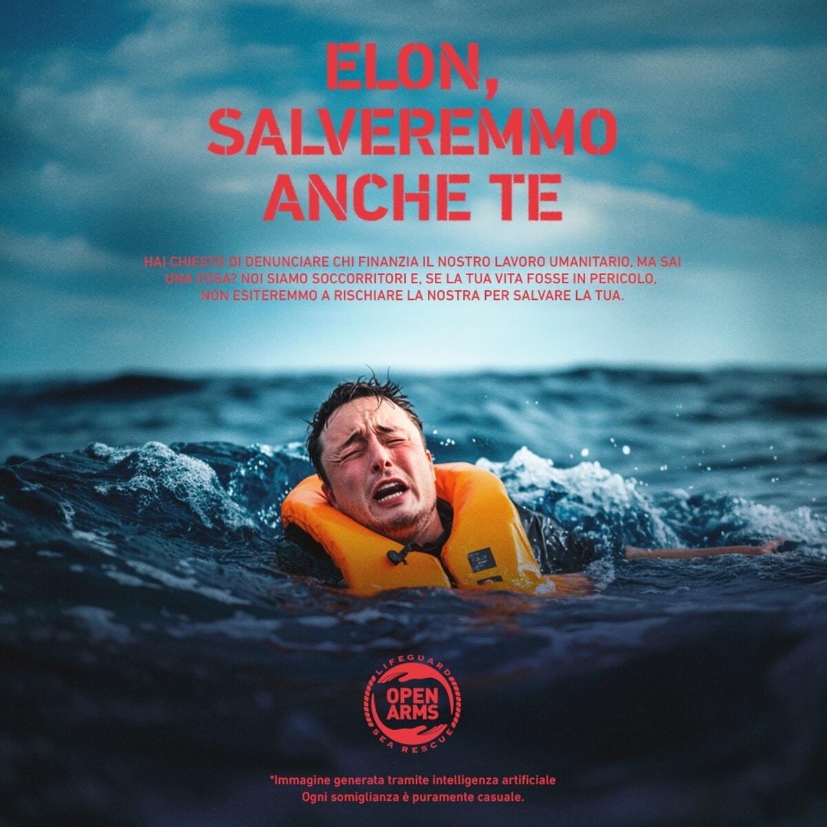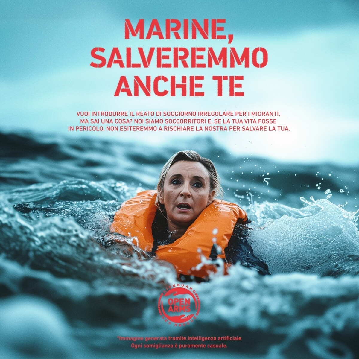 Open Arms ha lanciato una campagna pubblicitaria destinata a far discutere, utilizzando l’intelligenza artificiale per trasformare alcuni leader politici e figure influenti in migranti naufraghi. Tra i volti raffigurati: Giorgia Meloni, Donald Trump, Ursula von der Leyen, Marine Le Pen, Viktor Orbán, Matteo Salvini ed Elon Musk, ritratti mentre annaspano in mare con un giubbotto di salvataggio. Sopra ogni immagine campeggia la scritta: “Salveremmo anche te. Quando una vita è in pericolo in mare, la salviamo.”