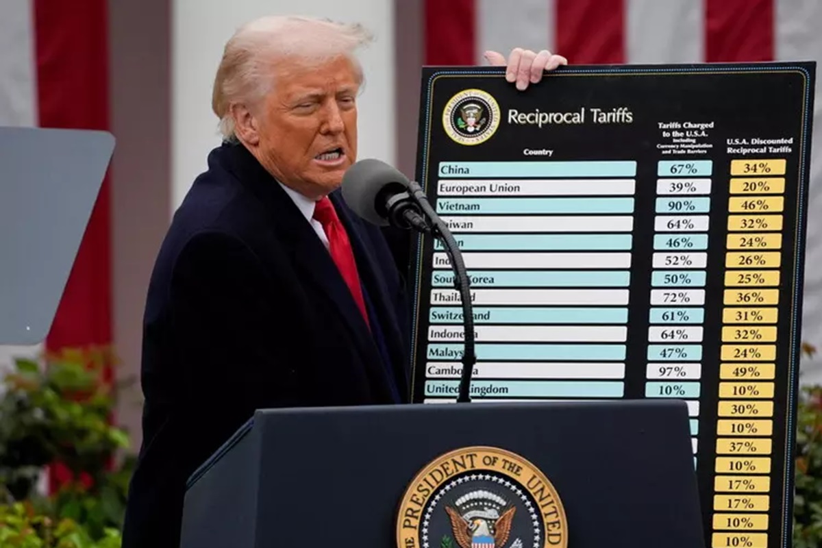 Il presidente degli Stati Uniti Donald Trump il giorno che impose i suoi dazi (Foto Ansa)