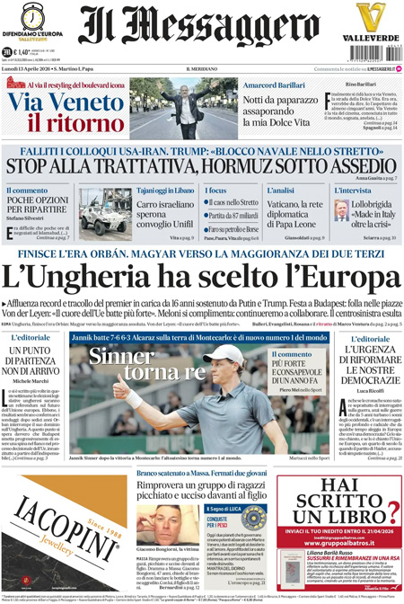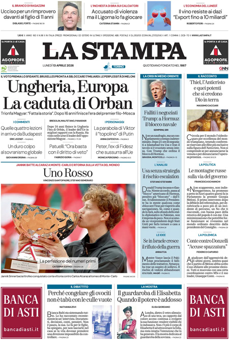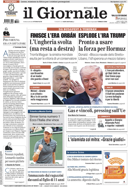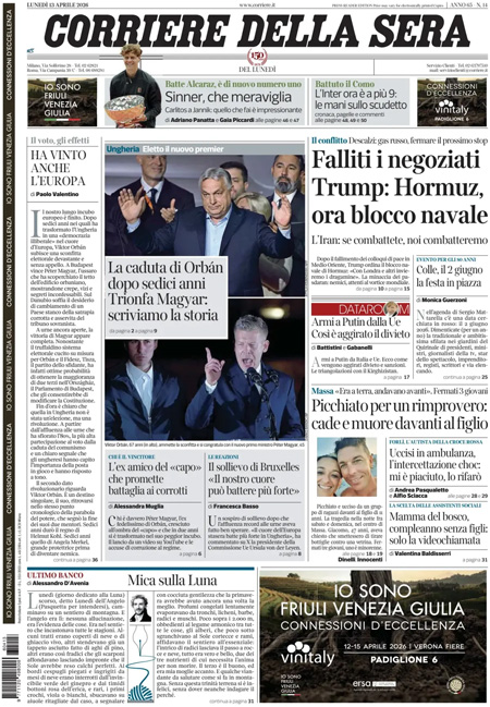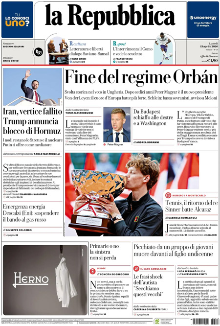 La principale notizia di oggi in apertura sui quotidiani è quella relativa alle elezioni in Ungheria, con la vittoria del partito di opposizione Tisza guidato da Péter Magyar e la fine del governo di Viktor Orbán dopo 16 anni. In primo piano anche il fallimento dei negoziati fra Iran e Stati Uniti in Pakistan, con Trump che annuncia un blocco navale dello stretto di Hormuz. In primo piano anche le elezioni in Ungheria e la vittoria del partito di opposizione Tisza guidato da Péter Magyar e la fine dopo 16 anni del governo di Viktor Orbán. “Fine del regime Orbán”, è l’apertura di Repubblica. “Falliti i negoziati. Trump: Hormuz, ora blocco navale”, è invece la prima pagina del Corriere della Sera. “Usa-Iran, primo round fallito. Il regime è più forte di prima”, titola il Fatto Quotidiano.