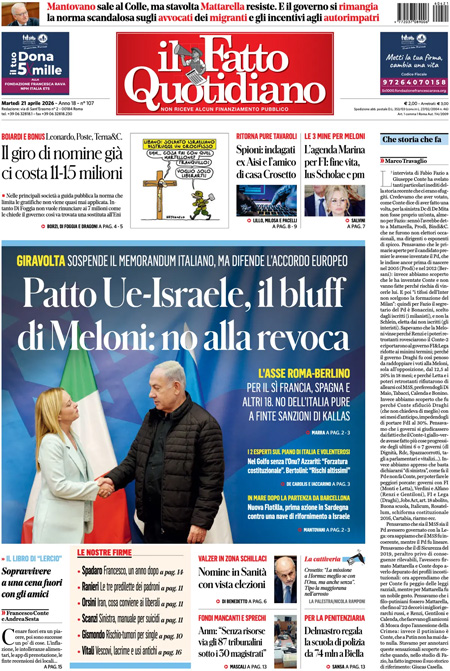“Patto Ue-Israele, il bluff di Meloni: no alla revoca” (Il Fatto Quotidiano).
