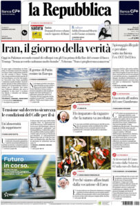 La notizia principale di oggi in apertura sui quotidiani è quella relativa ai negoziati fra Iran e Stati Uniti, alla minaccia del presidente Dondald Trump di non prolungare il cessate il fuoco oltre la scadenza fissata e all’incontro previsto per oggi a Islamabad, sul quale però non c’è ancora la certezza della partecipazione della delegazione iraniana. “Iran, il giorno della verità”, è l’apertura di Repubblica. “Scommessa Trump: Oggi faccio la pace”, titola La Stampa. “Patto Ue-Israele, il bluff di Meloni: no alla revoca”, è invece la prima pagina del Fatto Quotidiano.