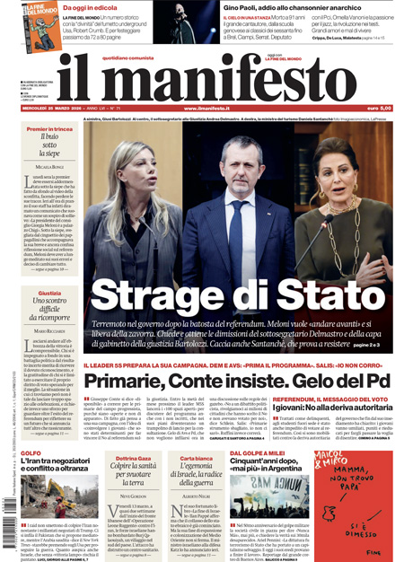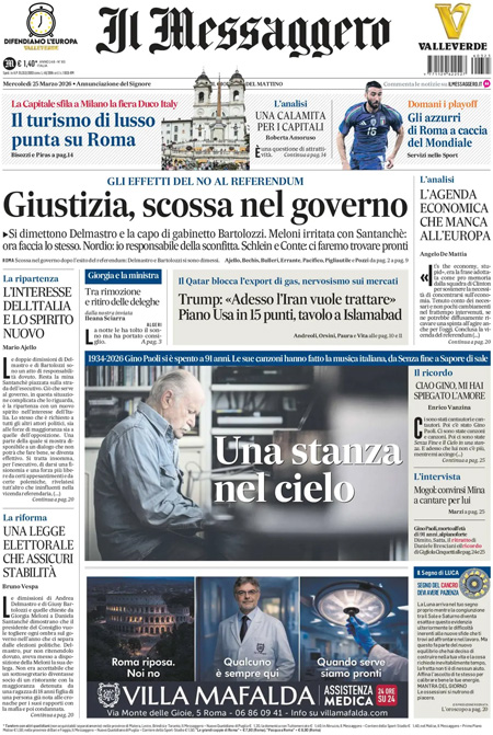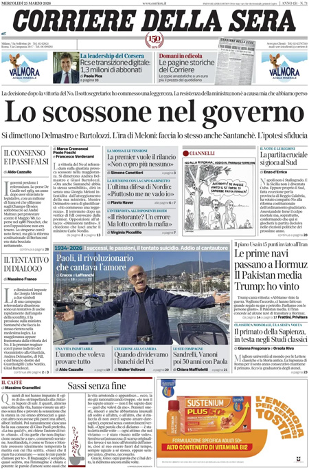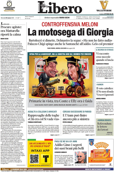 La notizia principale di oggi in apertura sui quotidiani è quella relativa alle dimissioni del sottosegretario alla giustizia Delmastro e della capo di gabinetto dello stesso ministero Bartolozzi, a seguito della vittoria del No al referendum. “Governo, slavina referendum”, titola La Stampa. “Terremoto nel governo”, è l’apertura di Repubblica. “La motosega di Giorgia”, è invece la prima pagina di Libero.