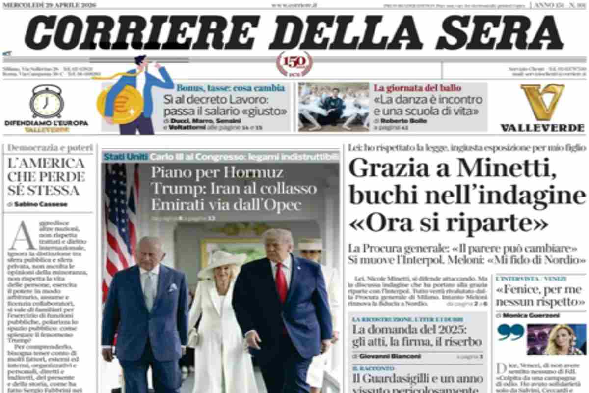 La notizia principale di oggi in apertura sui quotidiani è quella relativa alla grazia concessa a Nicole Minetti con le nuove indagini decise dalla procura di Milano e lo scontro con il ministro della Giustizia Carlo Nordio, il cui operato è stato difeso dalla premier Meloni. “Grazia a Minetti, buchi nell’indagine. Ora si riparte”, è l’apertura del Corriere. “Meloni difende Nordio”, è invece la prima pagina di Repubblica. “Caso Minetti: con un nuovo reato, la grazia può saltare”, titola Il Fatto Quotidiano.