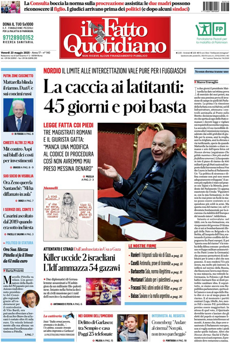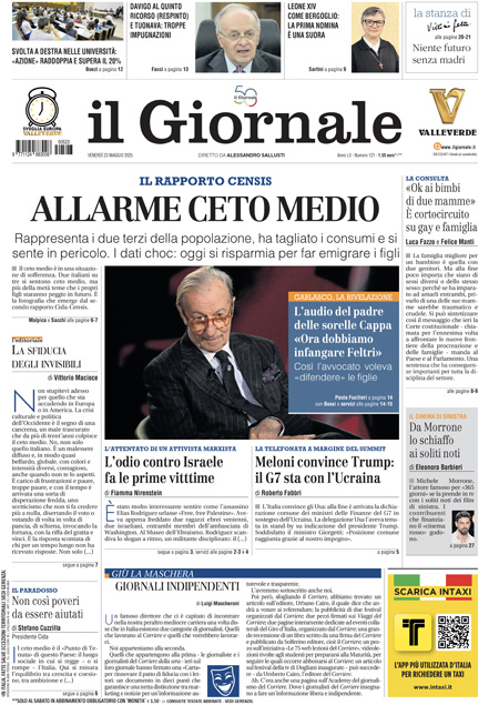 Il Giornale si concentra sul nuovo rapporto del Censis, che analizza le difficoltà e le trasformazioni del ceto medio italiano. Il Fatto Quotidiano invece critica nuovamente le attuali leggi sulle intercettazioni, mentre Libero rilancia gli sviluppi dell’inchiesta sull’omicidio di Chiara Poggi, avvenuto nel 2007. Infine, i quotidiani sportivi sono focalizzati sugli scontri decisivi di Serie A tra Napoli e Inter: il verdetto sullo scudetto è ormai imminente.
