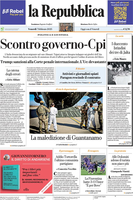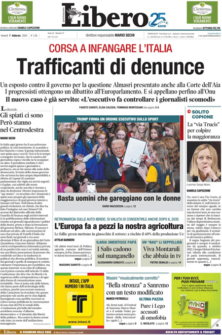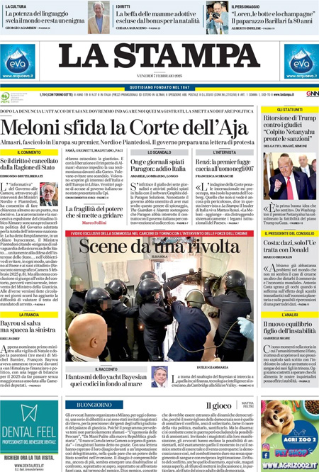 Le principali notizie sulle prime pagine di oggi riguardano il confronto tra il governo italiano e la Corte penale internazionale in seguito alla liberazione di Almasri e la vicenda delle persone spiate su WhatsApp tramite un software di una società israeliana. “Almasri, il caso arriva in Europa”. titola Il Corriere della Sera. “Scontro governo-Cpi”, è l’apertura di Repubblica. “Spionaggio di Stato: Israele scarica l’Italia”, titola invece il Fatto Quotidiano.