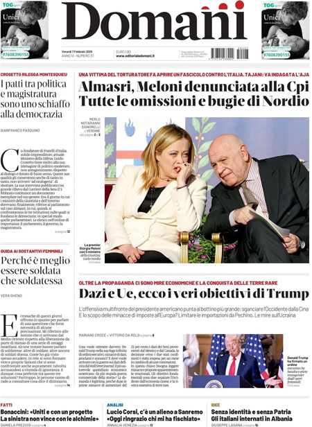 “Almasri, Meloni denunciata alla Cpi. Tutte le omissioni e bugie di Nordio” (Domani).