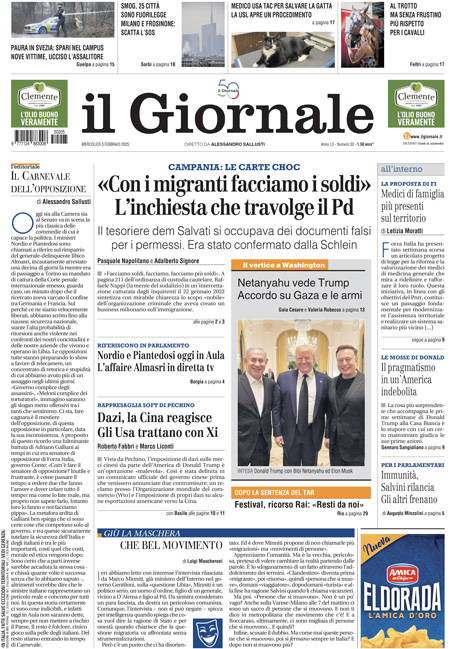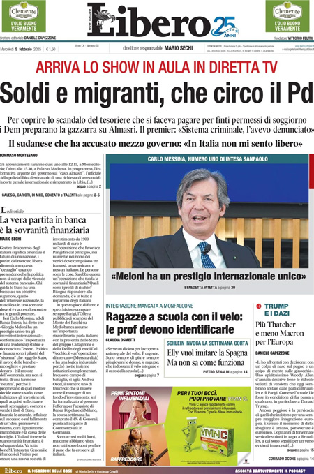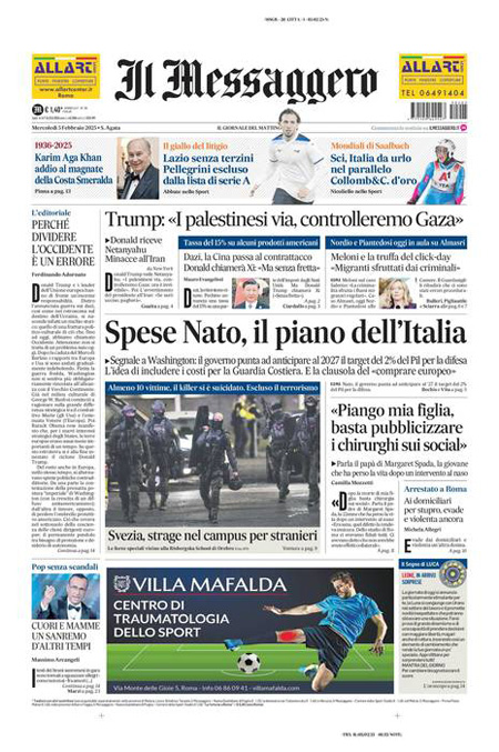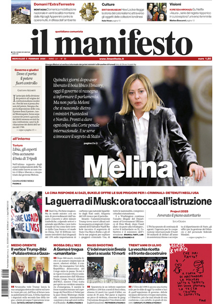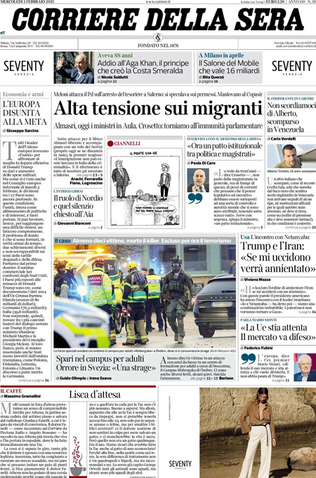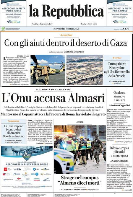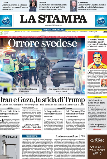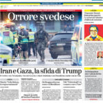Sono diversi gli argomenti trattati sulle prime pagine di oggi: la questione della liberazione del capo della polizia giudiziaria libica Almasri, sulla quale oggi riferiranno in Parlamento i ministri Piantedosi e Nordio, l’incontro fra il presidente degli Stati Uniti Trump e il primo ministro israeliano Netanyahu e la sparatoria in una scuola in Svezia, in cui sono morte undici persone.