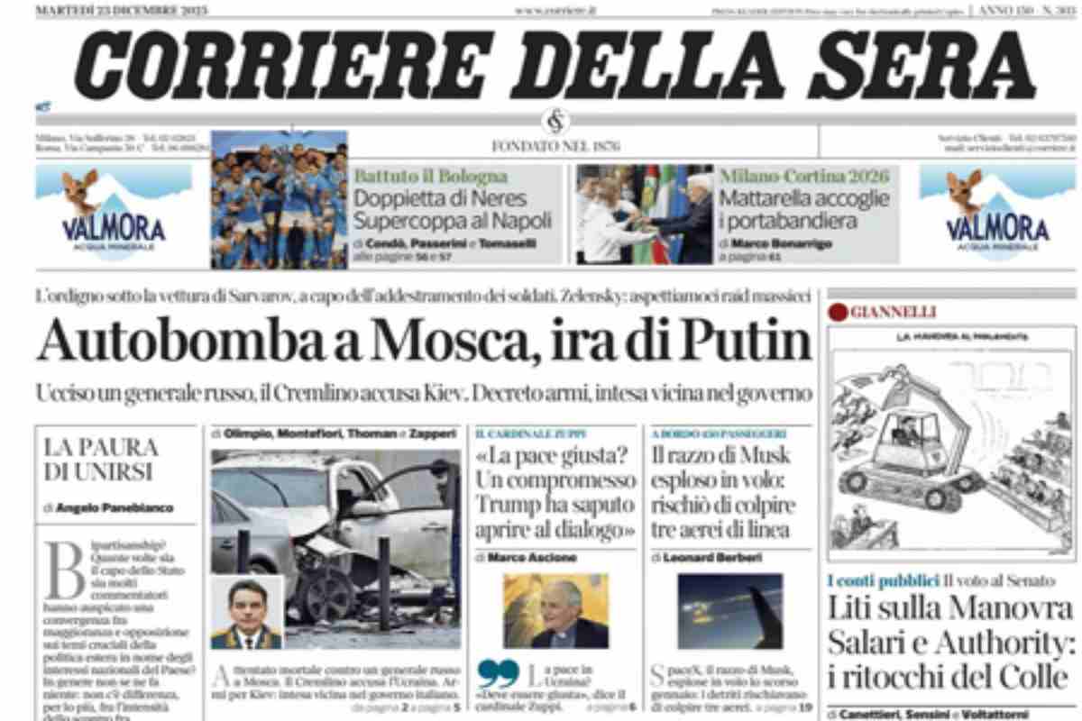 Sono due le principali notizie di oggi in apertura sui quotidiani: la discussione in Senato sulla legge di bilancio, che dovrebbe essere approvata oggi e passare quindi alla Camera, e la morte di un generale russo a Mosca dopo l’esplosione di una bomba sotto la sua auto. “Autobomba a Mosca, ira di Putin”, titola il Corriere. “Manovra, un altro stop”, è l’apertura di Repubblica. “Il Colle taglia l’urlo all’Inno di Mameli”, è invece la prima pagina del Fatto Quotidiano.