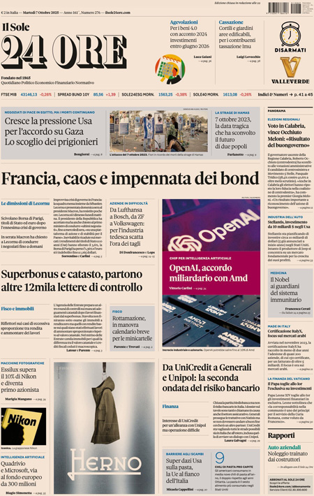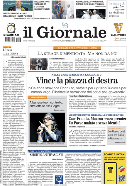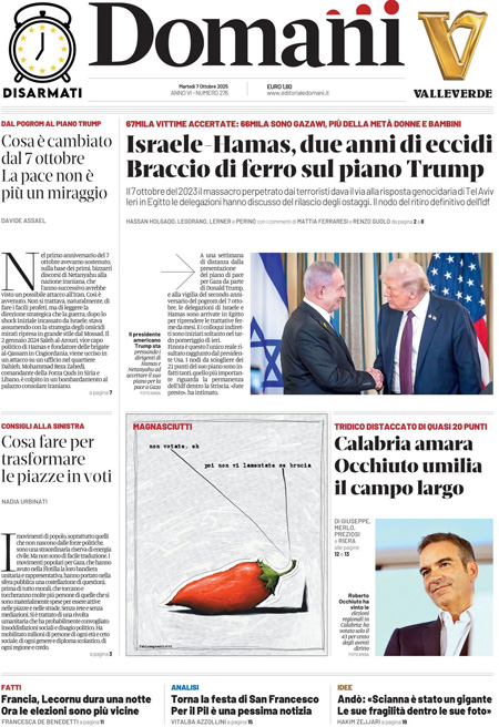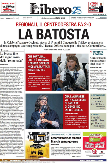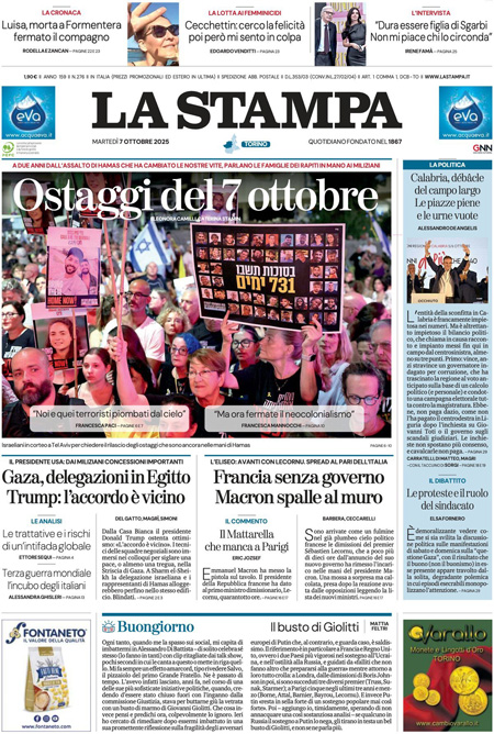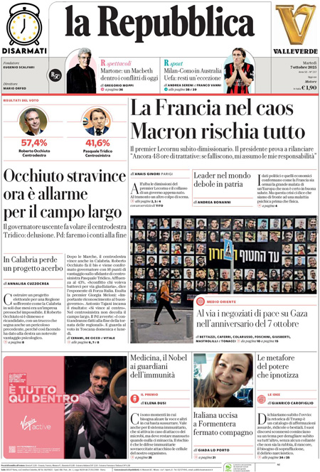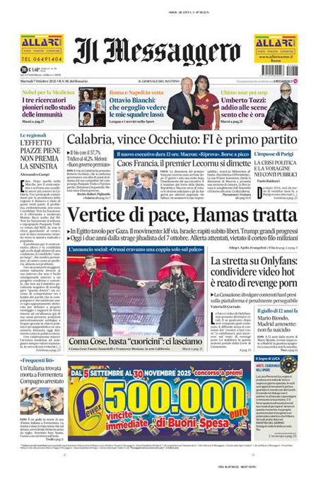 Sono diverse le notizie di oggi in apertura sui quotidiani: dalle elezioni regionali in Calabria, vinte dal candidato della coalizione di destra Roberto Occhiuto, all’inizio delle trattative fra Israele e Hamas; dall’anniversario delle stragi compiute da Hamas due anni fa, alle dimissioni del primo ministro francese Sébastien Lecornu. “Calabria, domina il centrodestra”, titola il Corriere. “La Francia nel caos. Macron rischia tutto”, è l’apertura di Repubblica. “Flotilla, i pm indagano su Tel Aviv (e su Roma)”, è la prima pagina del Fatto Quotidiano.
