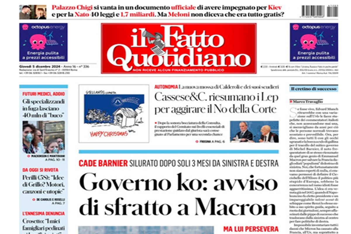 “Governo ko: avviso di sfratto a Macron”. (Il Fatto Quotidiano)