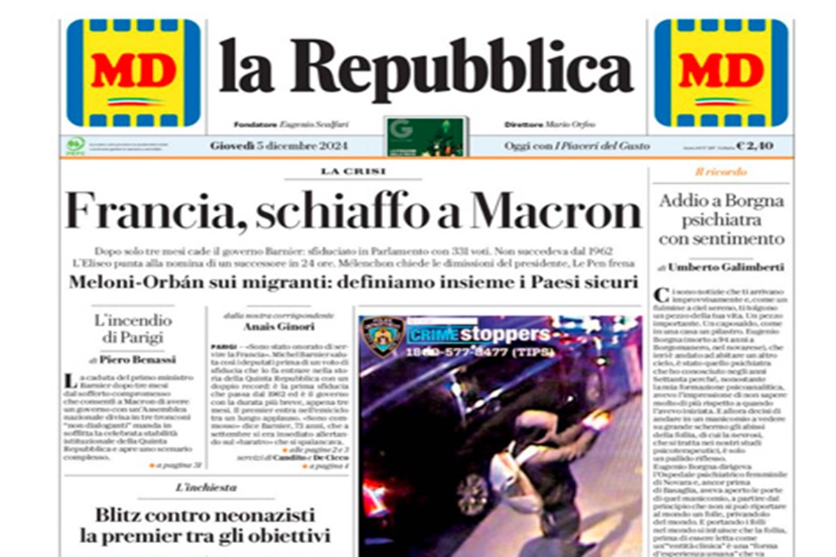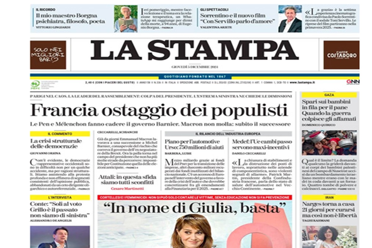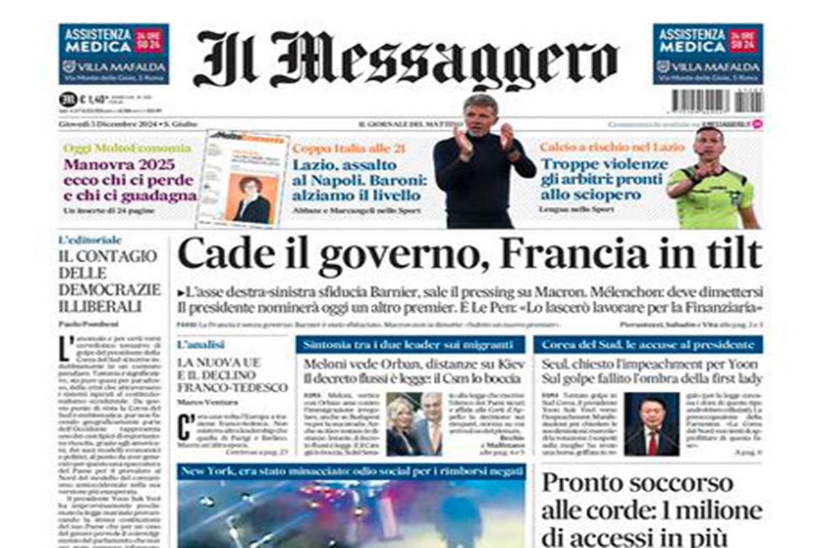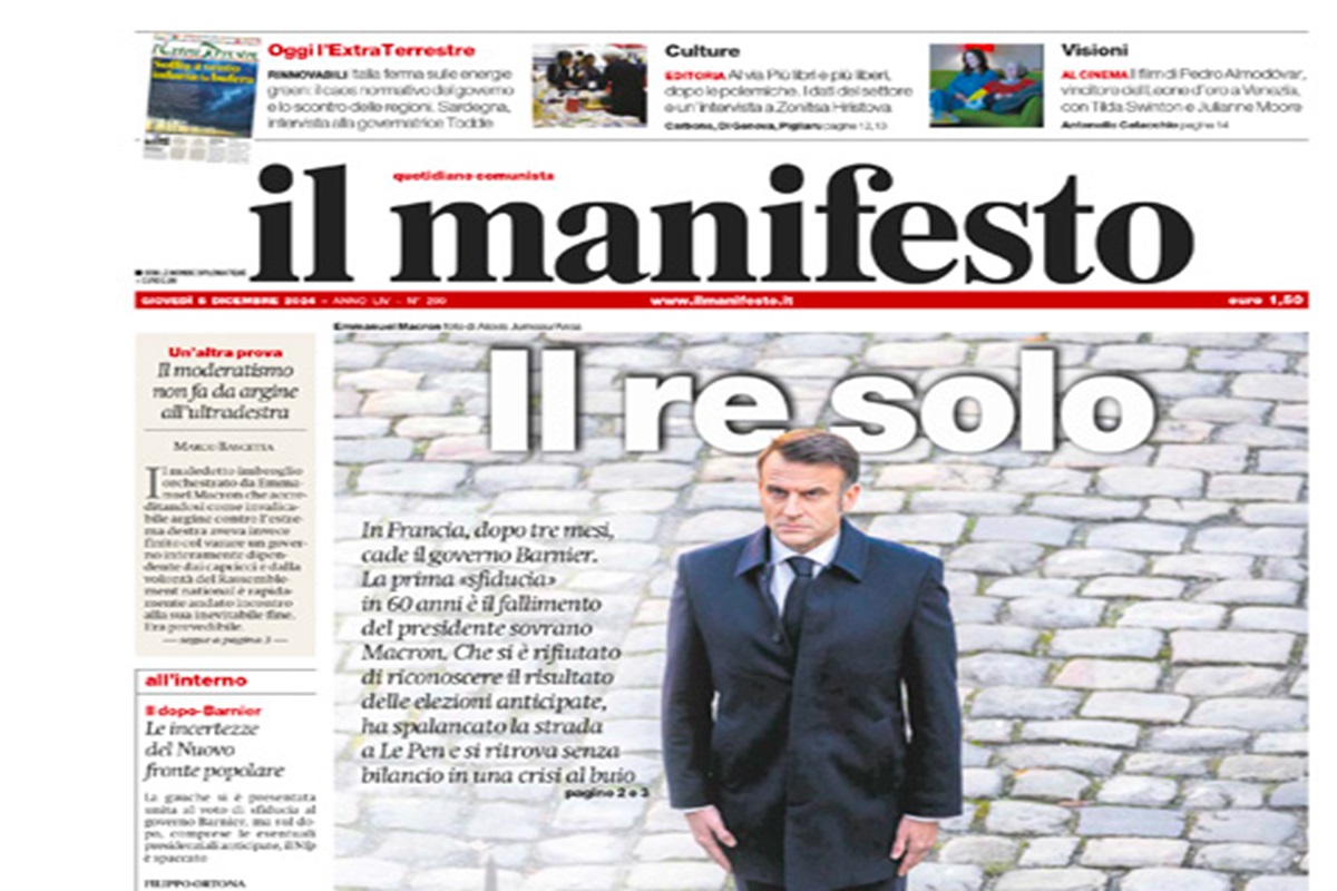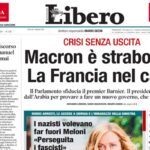 La caduta del governo di Barnier in Francia domina le prime pagine dei giornali di oggi. “Caos in Francia – titola il Corriere della Sera -, cade il governo”. Il Manifesto: “Il re è solo”. La Repubblica: “Schiaffo a Macron”. Libero: “Macron è strabollito. La Francia nel caos”. Sul Corriere della Sera l’editoriale di Aldo Cazzullo: “La mozione di censura che ha obbligato Barnier a dimettersi segna la fine del macronismo – nell’anno che, nella fantasia del suo fondatore, doveva essere quello della consacrazione. Avanzare al centro ha funzionato per due elezioni presidenziali, ora non più”.