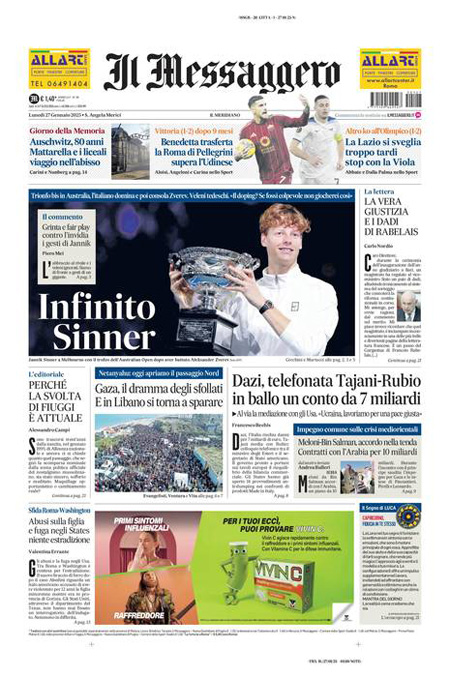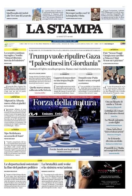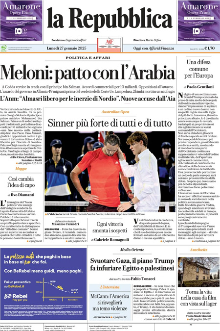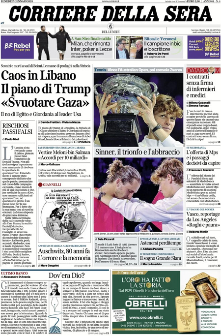 Home » L’EDICOLA, il Corriere: “Caos in Libano. Il piano di Trump: svuotare Gaza”. Repubblica: “Meloni: patto con l’Arabia”. Libero: “Meloni in Arabia, Sinner in Australia. Mezzo mondo rosica per l’Italia che vince”