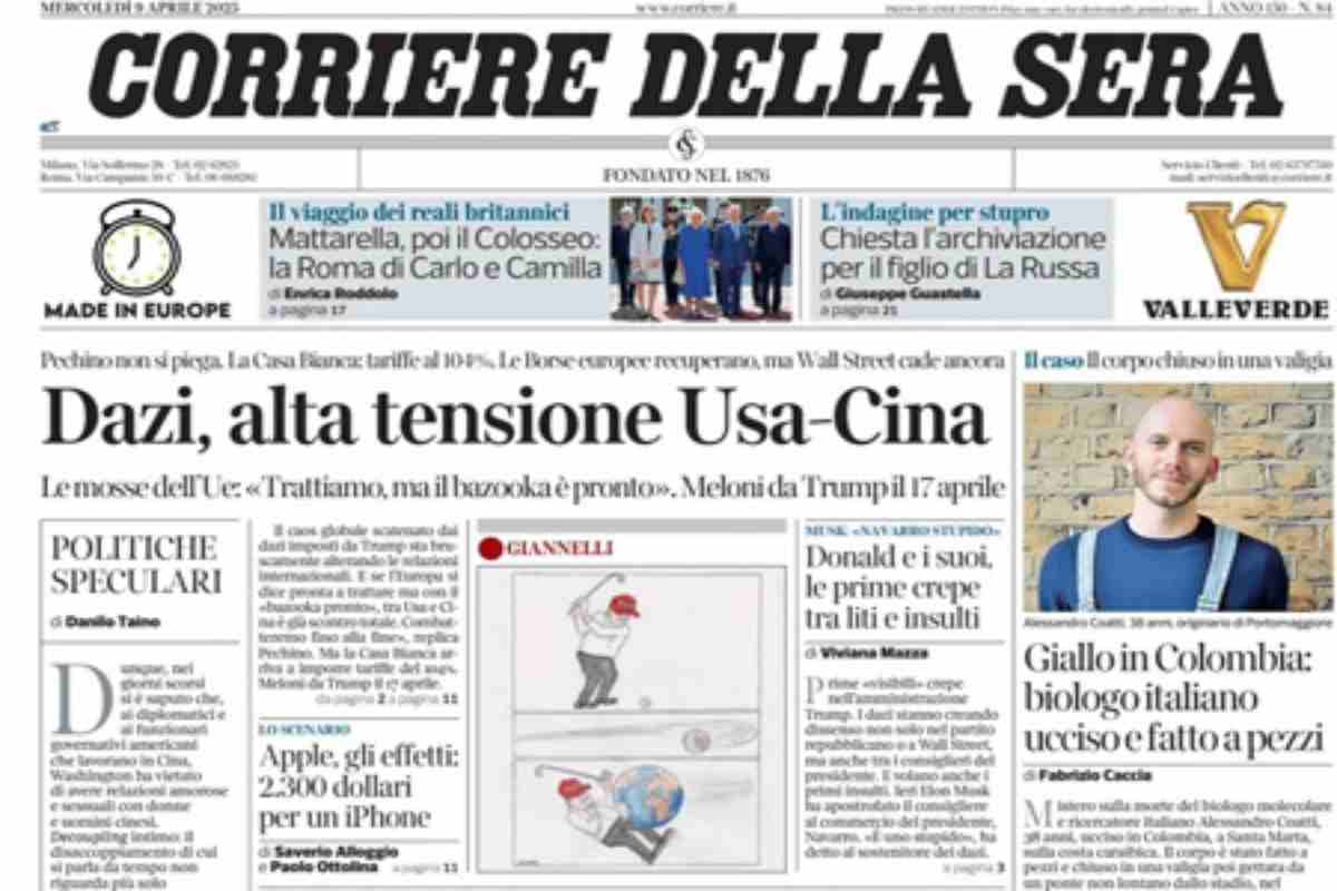 La notizia principale di oggi in apertura sui quotidiani è ancora una volta relativa ai dazi decisi dal presidente degli Stati Uniti Donald Trump. Si parla soprattutto dell’annuncio di Trump di dazi ancora più elevati per la Cina e del recupero delle Borse europee dopo le grosse perdite dei giorni scorsi. “Dazi, alta tensione Usa-Cina”, titola Il Corriere della Sera. “Trump: superdazi alla Cina”, è l’apertura di Repubblica. “Una muraglia di dazi”, è invece la prima pagina di Libero.