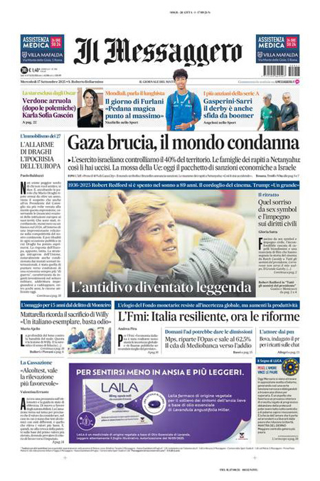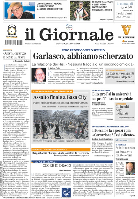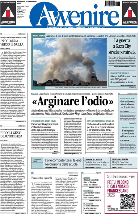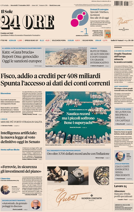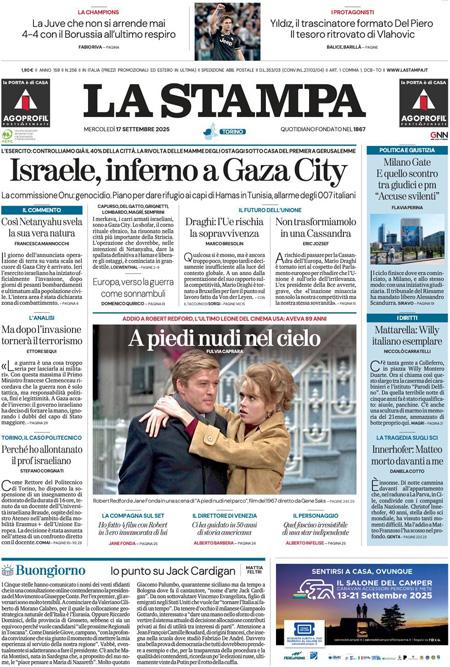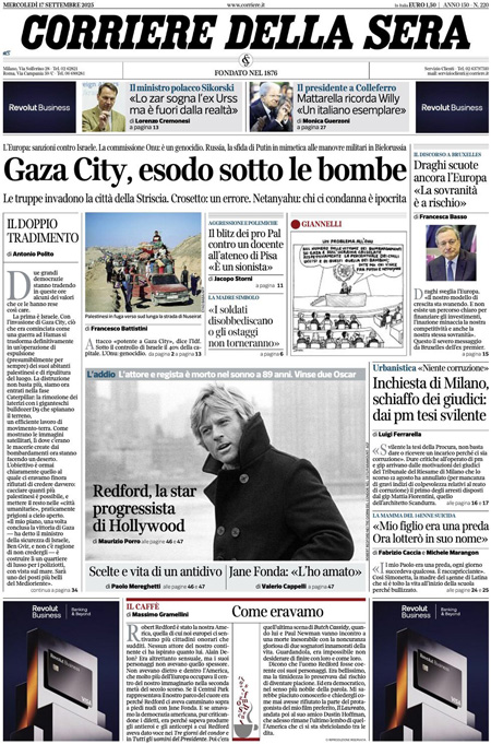 La notizia principale di oggi in apertura sui quotidiani è quella relativa all’inizio dell’operazione militare con cui l’esercito israeliano intende conquistare e occupare interamente la città di Gaza. Diversi quotidiani titolano anche riguardo alle conclusioni di una commissione d’inchiesta indipendente delle Nazioni Unite, secondo cui nella Striscia di Gaza è in corso un “genocidio”. “Gaza City, esodo sotto le bombe”, titola il Corriere. “Israele: distruggeremo Gaza”, è l’apertura di Repubblica. “Roma, no alla bandiera palestinese: Pd astenuto”, è invece la prima pagina de Fatto Quotidiano.