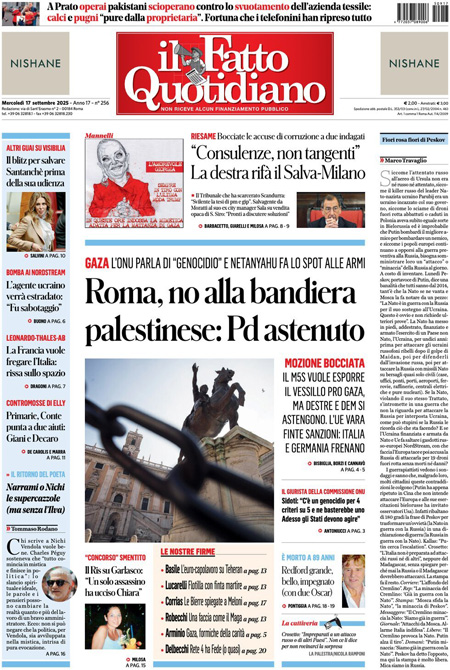 “Roma, no alla bandiera palestinese: Pd astenuto” (Il Fatto Quotidiano).