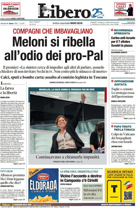 “Meloni si ribella all’odio dei pro-Pal” (Libero).