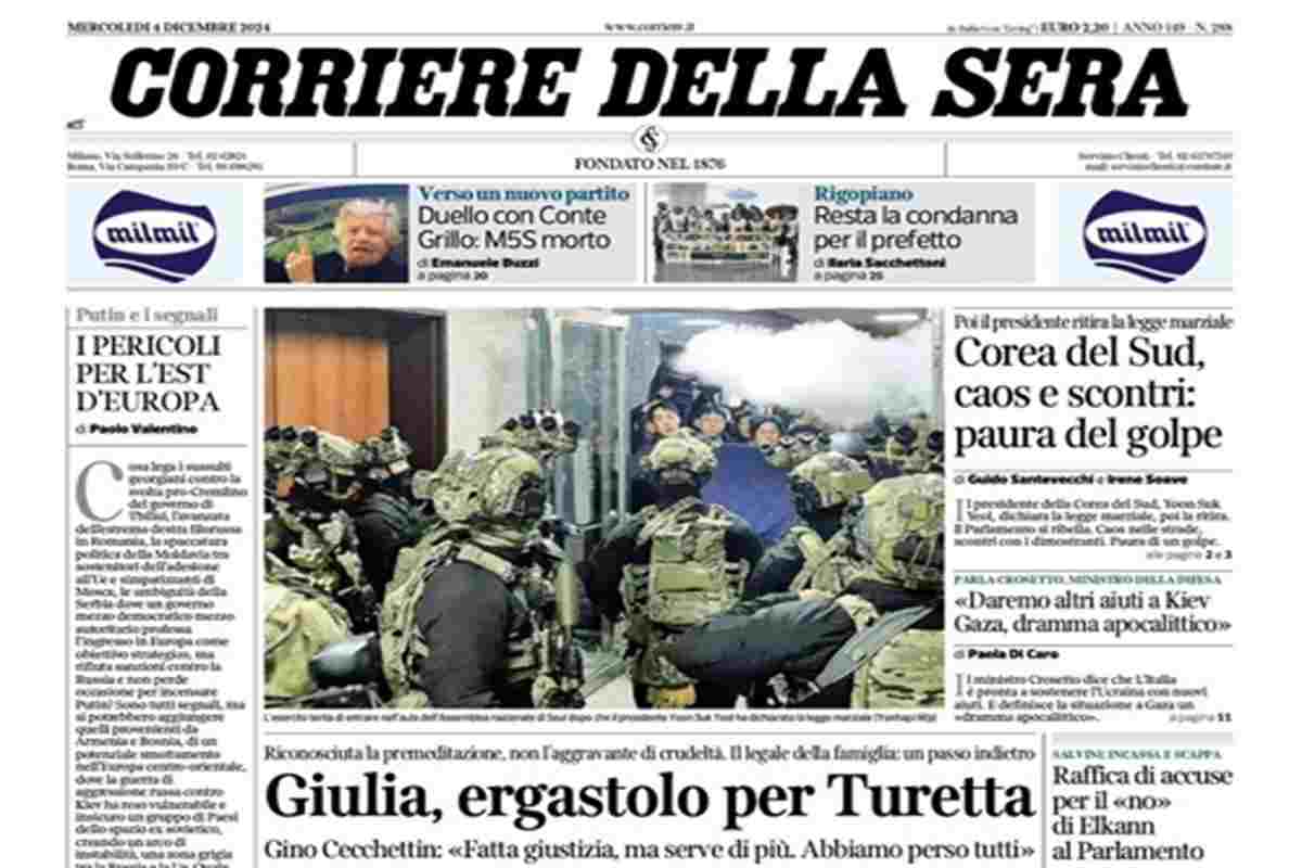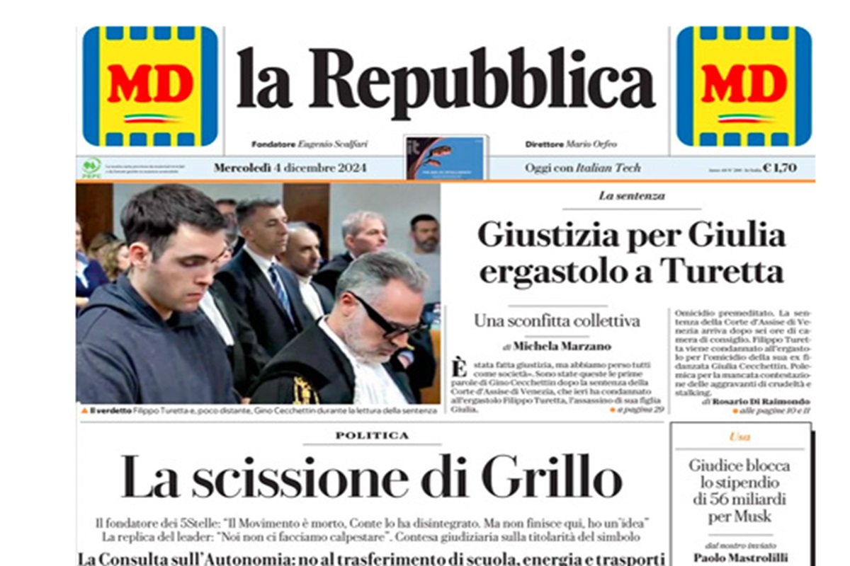 L’ergastolo a Filippo Turetta e la guerra civile all’interno del Movimento 5 Stelle sono i due argomenti principali sulle prime pagine di oggi. “Giulia, ergastolo per Turetta” titola il Corriere della Sera. La Repubblica invece apre sul Movimento 5 Stelle: “La scissione di Grillo”. “Grillo fa il funerale ai 5 Stelle. Conte&C. trafficano sul voto” è invece l’apertura della Verità.
