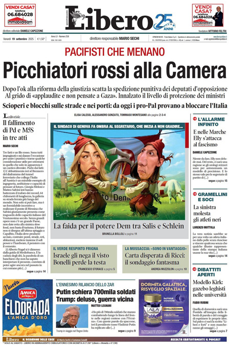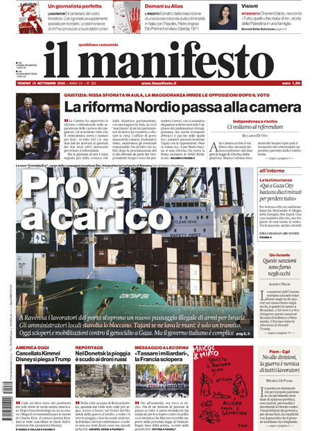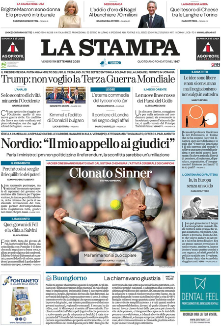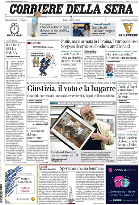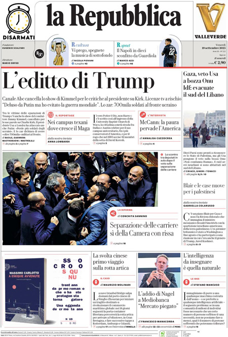 Sono due le notizie principali di oggi in apertura sui quotidiani: la bagarre tra i deputati alla Camera dopo l’approvazione del disegno di legge sulla separazione delle carriere dei magistrati, e la decisione della rete statunitense ABC di sospendere il talk show di Jimmy Kimmel dopo le parole del conduttore sull’uccisione dell’attivista di destra Charlie Kirk. “Agguato del Pd: rissa alla Camera”, titola La Verità. “L’editto di Trump”, è l’apertura di Repubblica. “Giustizia, il voto e la bagarre”, è invece la prima pagina del Corriere.