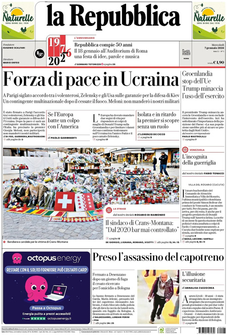 Sono diverse le notizie di oggi in apertura sui quotidiani: la riunione a Parigi dei “volenterosi” per discutere riguardo al futuro dell’Ucraina, le indagini sull’incendio di Capodanno nel locale di Crans-Montana, in cui sono morte 40 persone, e le dichiarazioni dei leader dei principali Paesi europei che hanno ribadito che la Groenlandia fa parte della Danimarca, in risposta alle parole del presidente degli Stati Uniti Donald Trump riguardo l’ipotesi di annettere l’isola. “Groenlandia, stop europeo a Trump”, titola il Corriere. “Forza di pace in Ucraina”, è l’apertura di Repubblica. “La prova che inchioda gli svizzeri”, è la prima pagina di Libero.