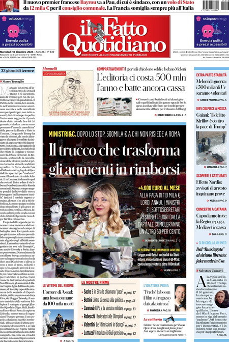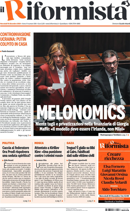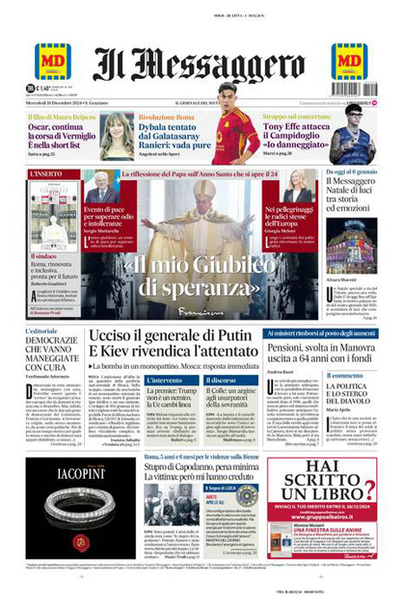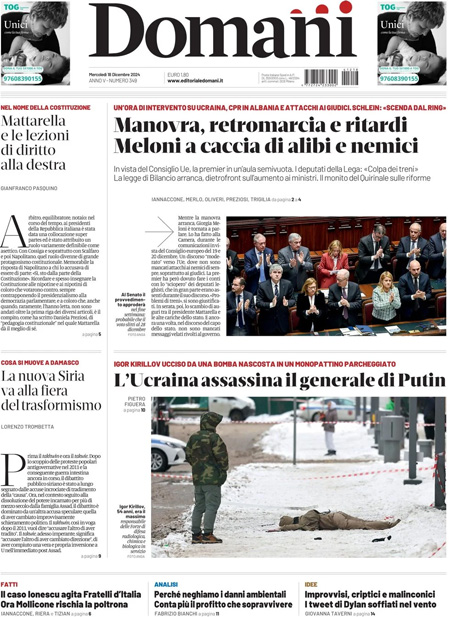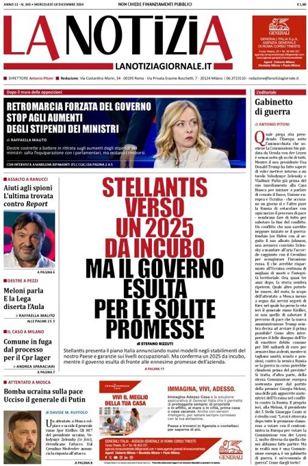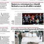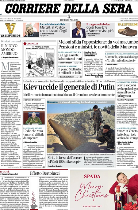 L’uccisione del generale Kirillov a Mosca, la manovra e l’accordo tra il governo e Stellantis. Sono questi i principali temi sulle prime pagine di oggi. “Kiev uccide il generale di Putin” titola il Corriere della Sera. “Auto, patto governo-Stellantis” è l’apertura della Stampa. Il Fatto Quotidiano apre invece sulla manovra e sull’emendamento per alzare i rimborsi ai ministri non parlamentari: “Il trucco che trasforma gli aumenti in rimborsi”.