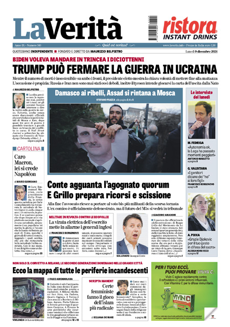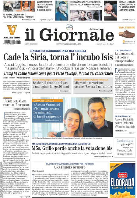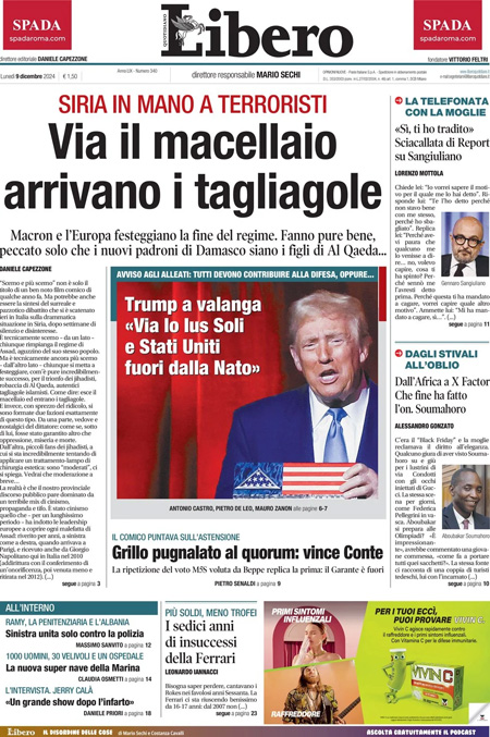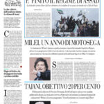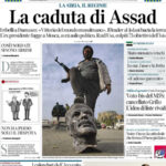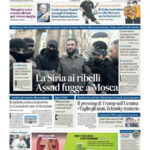 La notizia principale sulle prime pagine di oggi è la fine del regime dell’ex dittatore Assad in Siria, che si è rifugiato in Russia con la famiglia. Il Corriere della Sera titola: “La caduta di Assad” mentre Il Giornale scrive: “Cade la Siria, torna l’incubo Isis”. Il Fatto Quotidiano titola: “Siria, Assad già a Mosca. Usa e Turchia spingono il neo-Califfato jihadista”.