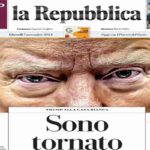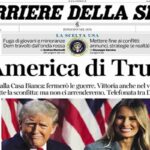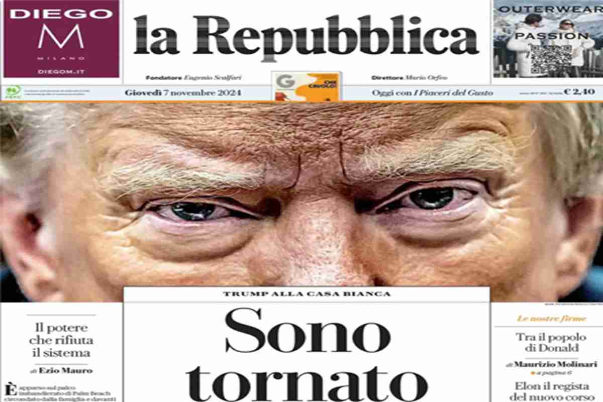 L’elezione di Donald Trump, e non poteva essere altrimenti, è l’argomento del giorno sui giornali di oggi. “L’America di Trump” titola il Corriere della Sera. “L’Europa debole e un paracadute che non c’è più” è l’editoriale di Federico Fubini. “Sono tornato” è l’apertura di Repubblica. “Il potere che rifiuta il sistema” è il commento di Ezio Mauro. “Trump fa impazzire la sinistra” è la prima pagina invece del Giornale. “Donald – scrive Alessandro Sallusti – stravince contro ogni previsione, conquistando il voto dei latinos e neri”.
