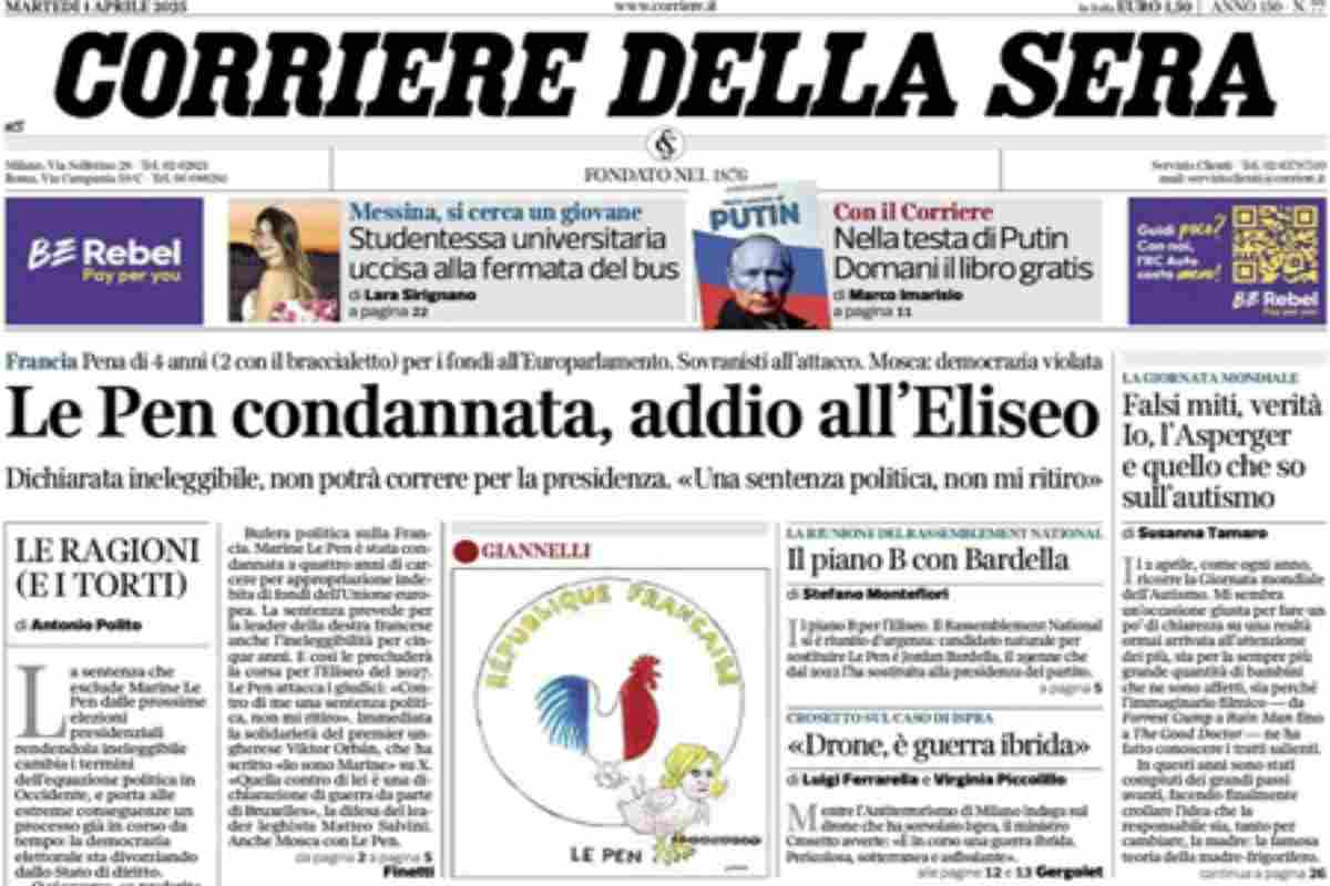 La principale notizia di oggi in apertura sui quotidiani è quella relativa alla condanna della leader del partito di estrema destra Rassemblement National Marine Le Pen a quattro anni di carcere e a cinque anni di ineleggibilità per appropriazione indebita di fondi pubblici del Parlamento europeo. “Le Pen, rivolta sovranista”, titola La Stampa. “Le Pen condannata, addio all’Eliseo”, è l’apertura del Corriere della Sera. “Ghigliottinata la destra”, è invece la prima pagina di Libero.